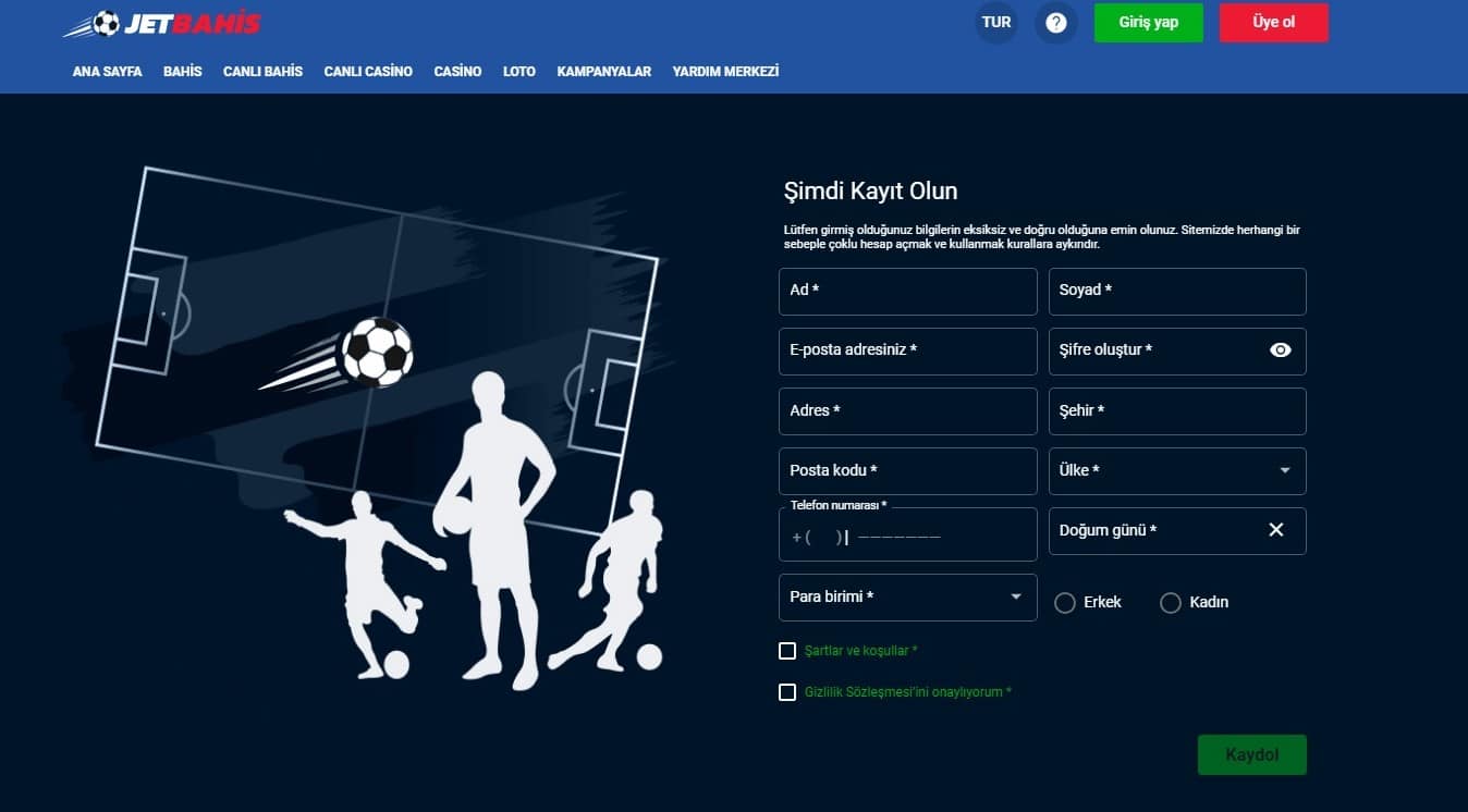 Öncelikle Jetbahis güncel adresiyle siteye giriş yapmanız gerekmektedir. Jetbahis’e giriş yapınca karşınıza gelen ekranın sağ üst köşesinde bulunan kırmızı renkli üye ol seçeneğine tıklamanız gerekmektedir. Sitenin Şimdi Kayıt Ol formunu doldurmaya başlayabilirsiniz. Çıkan ekrandaki formu doğru bir şekilde doldurmanız gerekmektedir. Formda sırasıyla;